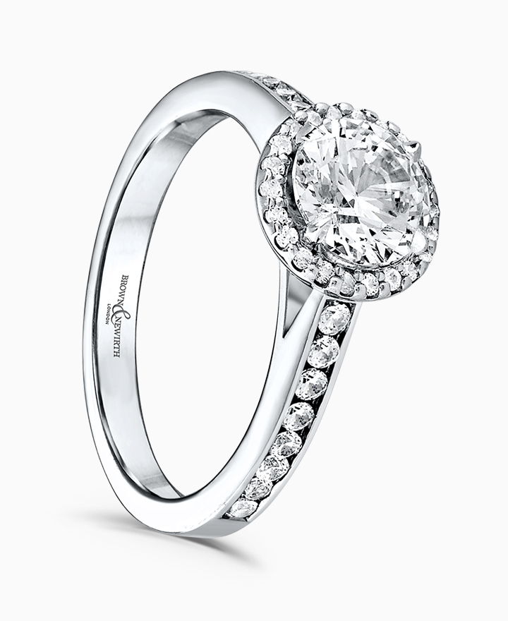 Handcrafted by Brown & Newirth; our signature 'bloom' floral detailing with diamond halo framing a round brilliant cut diamond, presented here on a diamond set band. Centre 1.00ct, total 1.35ct. Part of the Bloom Collection.