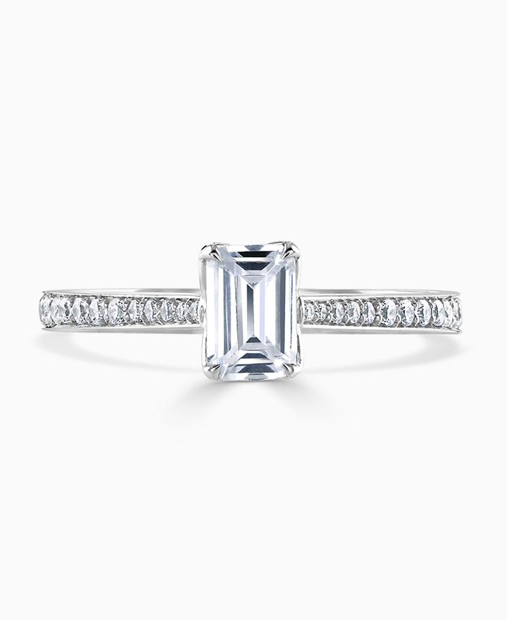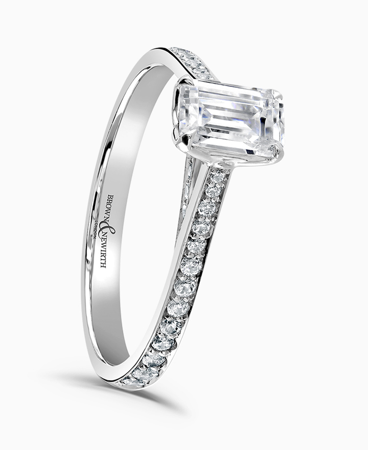 Handcrafted by Brown & Newirth; our signature 'bloom' floral detailing for a rectangular emerald cut diamond, presented here with side and shoulder set diamonds. Centre 0.50ct, total 0.77ct. Part of the Bloom Collection.