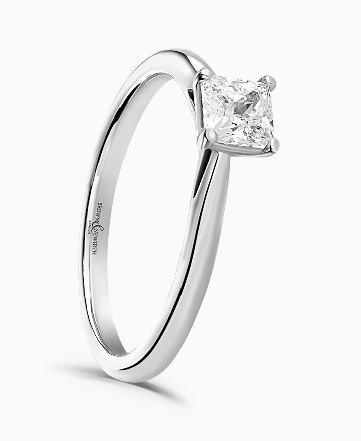 Handcrafted by Brown & Newirth; a delicate four claw setting perfectly elevates the square princess cut diamond, presented here on a classic court band. 0.50ct