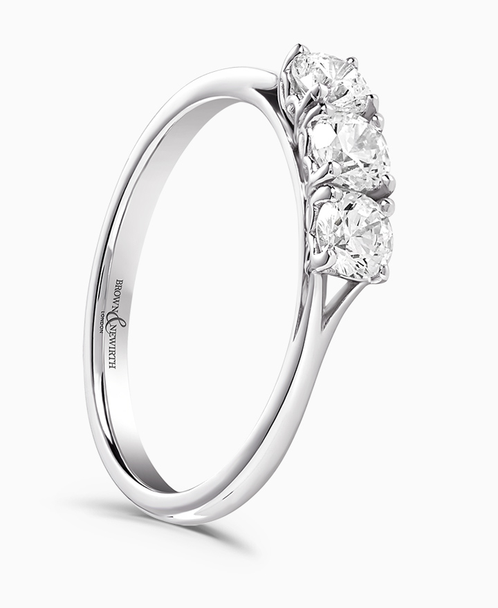 Handcrafted by Brown & Newirth; love heart detailing for this trilogy of round brilliant cut diamonds, presented here on a classic court band. 0.60ct
