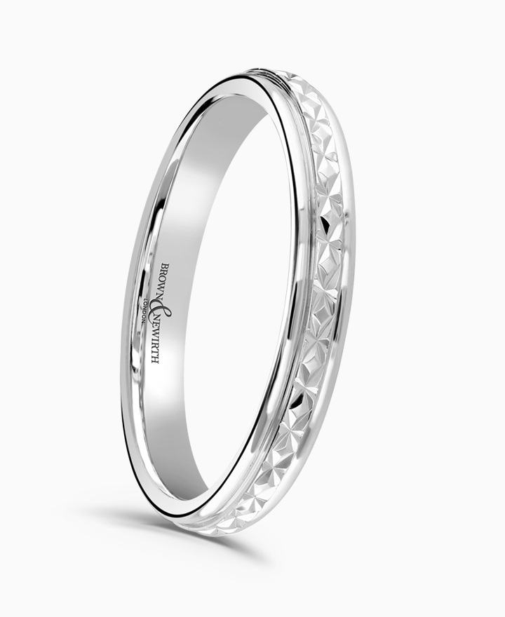 Handcrafted by Brown & Newirth; our classic court profile with diamond tip pattern and mill grain edges, presented in a heavy gauge.