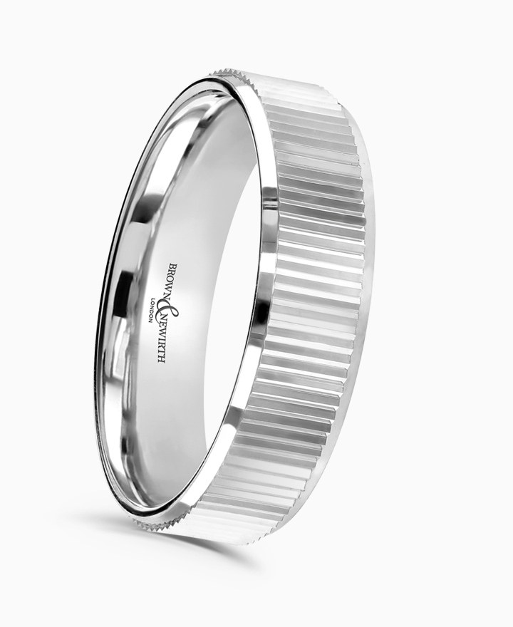 Handcrafted by Brown & Newirth; our flat top profile with v-groove patterning and bevelled edges, presented in a medium gauge. Part of the LOQD Collection