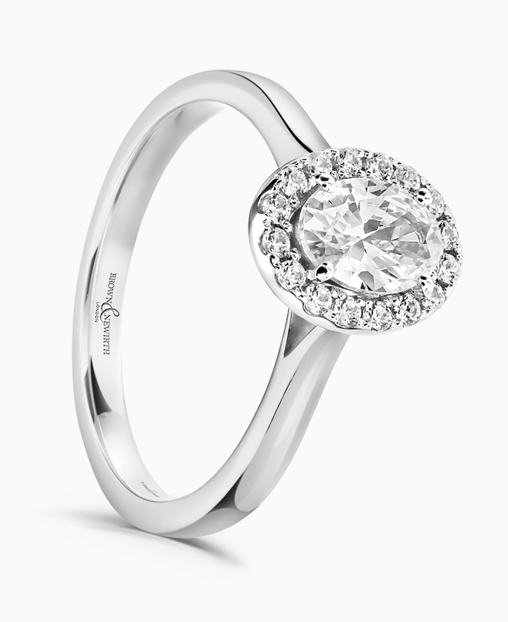 Handcrafted by Brown & Newirth; our signature 'bloom' floral detailing with diamond halo framing an oval cut G Vs diamond, presented here on a classic court band. Centre 0.50ct, total 0.60ct. Part of the Bloom Collection.