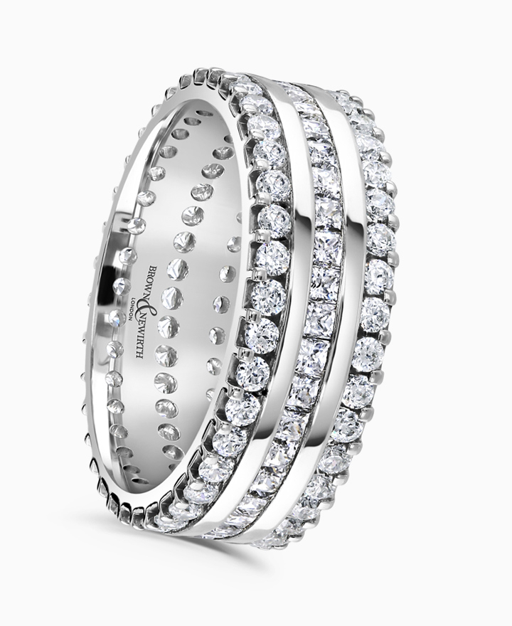 Handcrafted by Brown & Newirth; a triple row of square princess cut and round brilliant cut diamonds adorn the full hoop of this square edged band. Total carat weight 2.00ct
