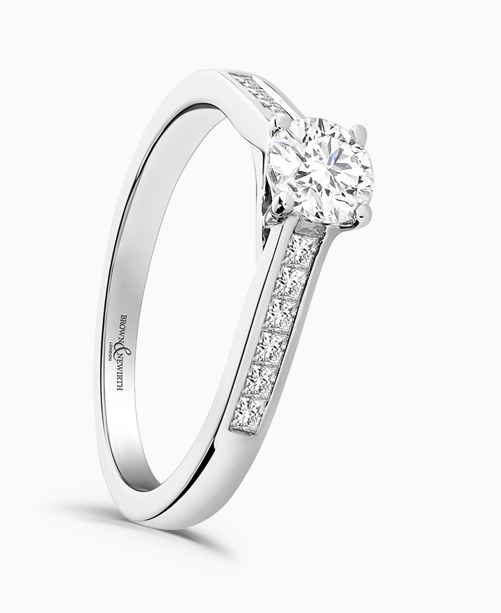 Handcrafted by Brown & Newirth; a delicate four claw setting perfectly elevates the round brilliant cut diamond, presented here with diamond set shoulders. Centre 0.33ct, total 0.49ct.