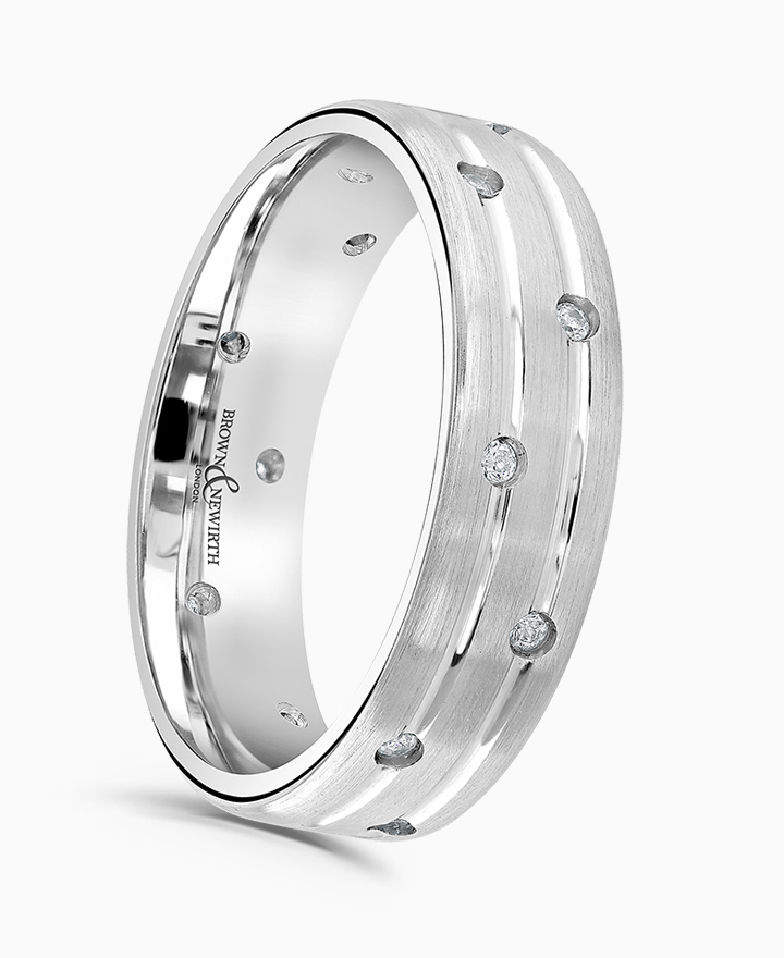 Handcrafted by Brown & Newirth; offset rows of round brilliant cut diamonds set around the full hoop in polished grooves with contrasting top, presented with a rolled edge on a flat band. Total carat weight 0.15ct
