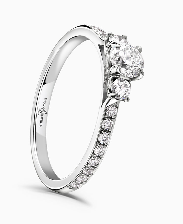 Handcrafted by Brown & Newirth; our signature 'bloom' floral detailing for this trilogy of round brilliant cut G Vs diamonds, presented here on a classic court band. Centre 0.50ct, total 0.83ct. Part of the Bloom Collection.