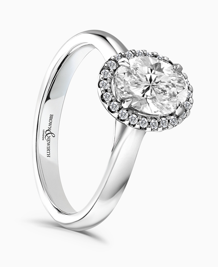 Handcrafted by Brown & Newirth; our signature 'bloom' floral detailing with diamond halo framing an oval cut diamond, presented here on a classic court band. Centre 1.00ct, total 1.10ct. Part of the Bloom Collection.