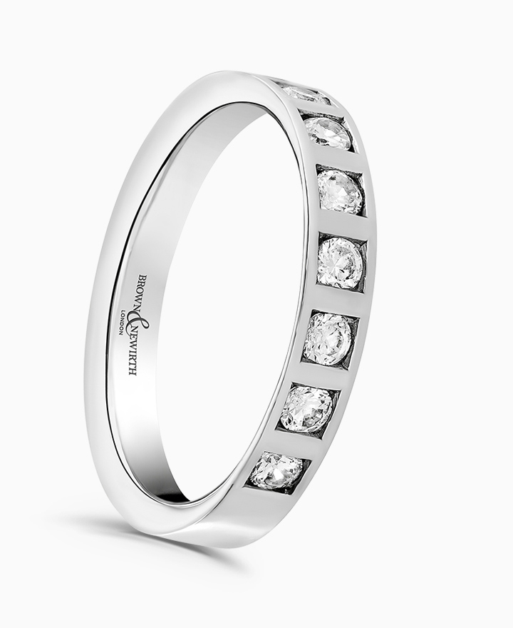 Handcrafted by Brown & Newirth; round brilliant cut diamonds in square settings adorn 50% of this straight edged band. Total carat weight 0.40ct