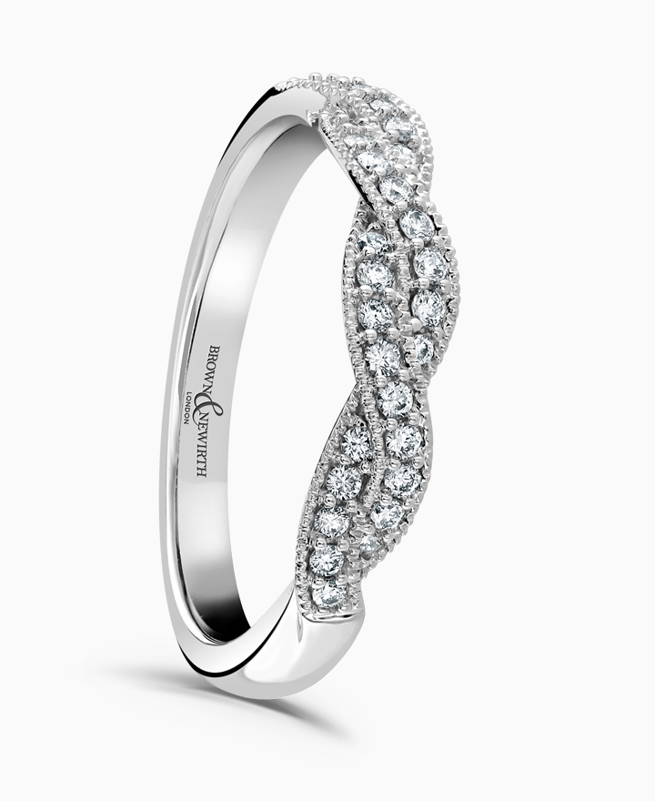Handcrafted by Brown & Newirth; twisting lines decorated with round brilliant diamonds on a classic court band. Part of the Lace Collection. Total carat weight 0.22ct