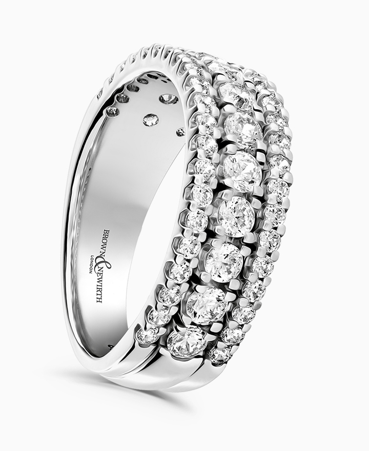 Handcrafted by Brown & Newirth; a triple row of round brilliant cut diamonds in an open setting adorn 50% of this square edged band. Total carat weight 1.10ct