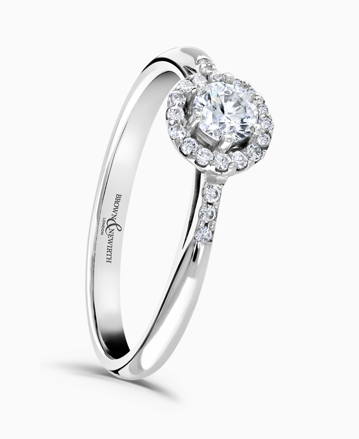Handcrafted by Brown & Newirth; a diamond halo frames the round brilliant cut diamond, presented here with diamond set shoulders. Centre 0.20ct, total 0.28ct.