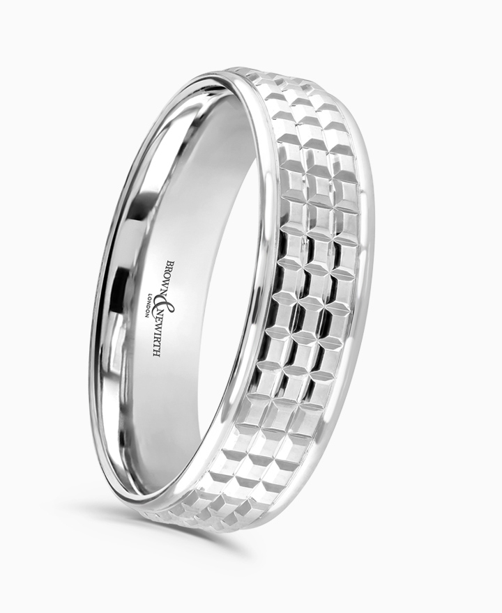 Handcrafted by Brown & Newirth; our flat top profile with cube patterning and rolled edges, presented in a medium gauge. Part of the Chocolate Collection