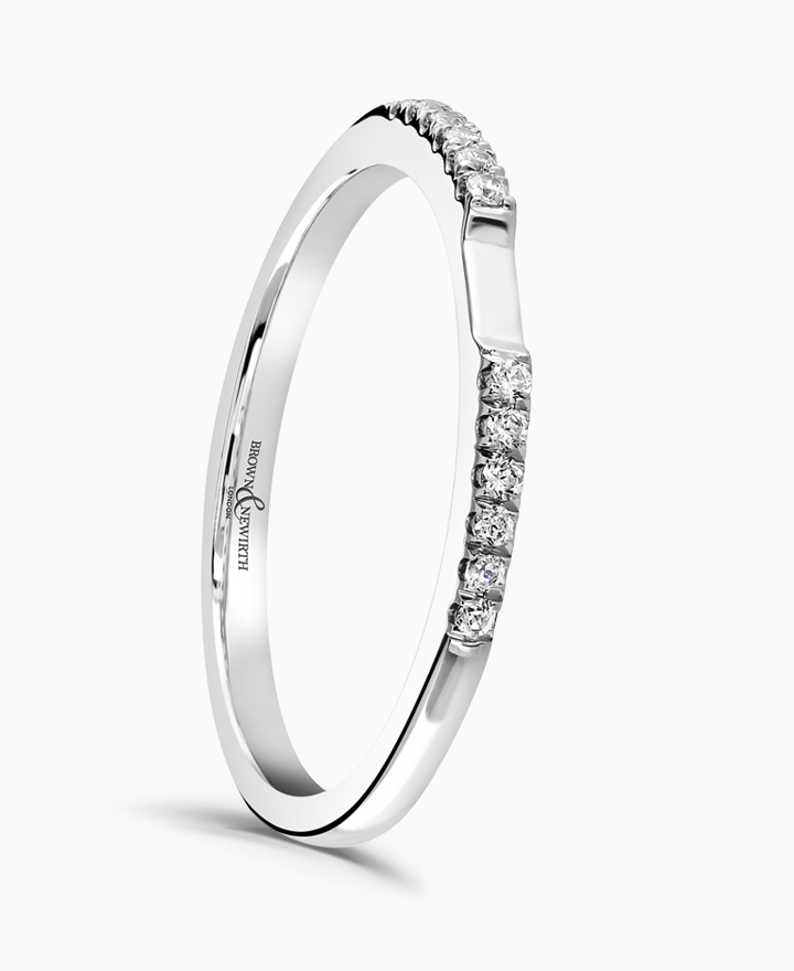 Handcrafted by Brown & Newirth; open set round brilliant cut diamonds with cut away for matching ring this straight edged band. Total carat weight 0.08ct