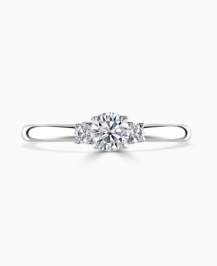 Handcrafted by Brown & Newirth; our signature 'bloom' floral detailing for this trilogy of round brilliant cut G Vs diamonds, presented here on a classic court band. Centre 0.30ct, total 0.40ct. Part of the Bloom Collection.