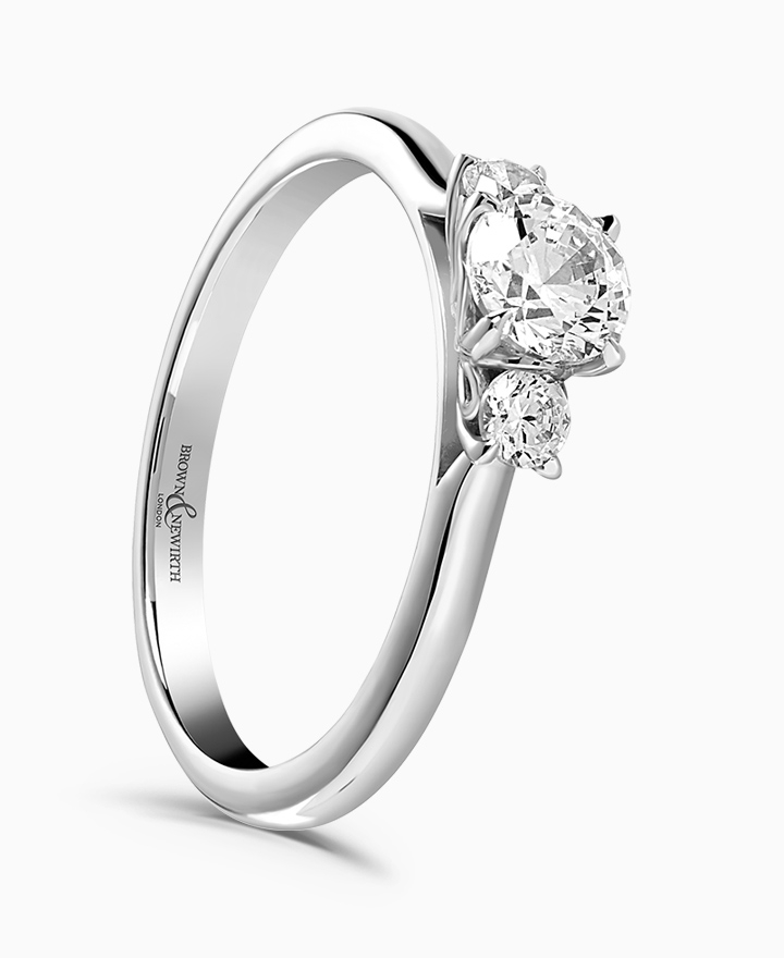 Handcrafted by Brown & Newirth; our signature 'bloom' floral detailing for this trilogy of round brilliant cut diamonds, presented here on a classic court band. Centre 0.50ct, total 0.66ct. Part of the Bloom Collection.