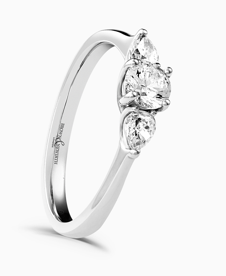 Handcrafted by Brown & Newirth; a claw set trilogy with pear cut diamonds sitting either side of a round brilliant cut diamond, presented here on a straight edged band. Centre 0.33ct, total 0.53ct.