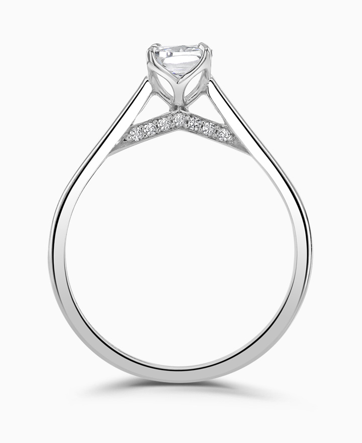 Signature. Handcrafted; our signature 'bloom' floral detailing for a cushion cut diamond, presented here with side set diamonds on a classic court band. Centre 0.70ct, total 0.77ct. Part of the Bloom Collection.