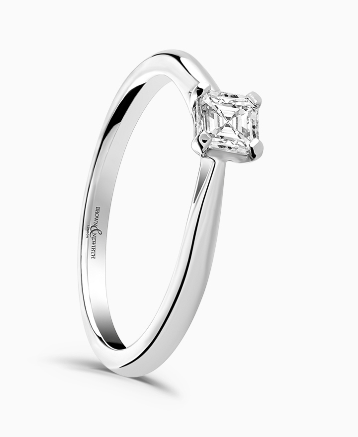 Handcrafted by Brown & Newirth; a delicate four claw setting perfectly elevates the square ashier cut diamond, presented here on a classic court band. 0.33ct