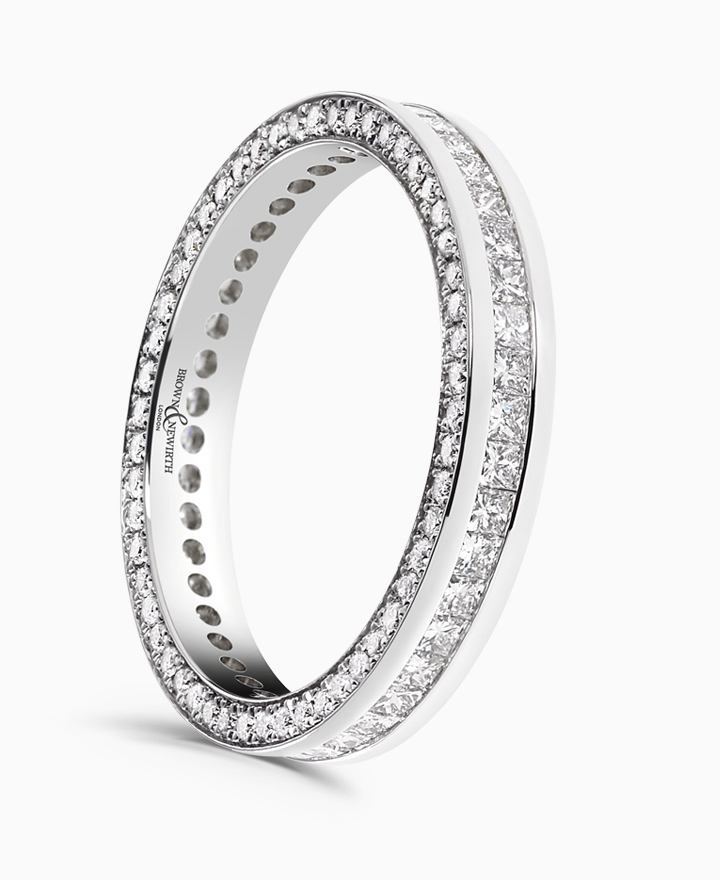 Handcrafted by Brown & Newirth; a full hoop of square princess cut diamonds elevated by side-set round brilliant cut diamonds. Part of the Opulence Collection. Total carat weight 1.25ct
