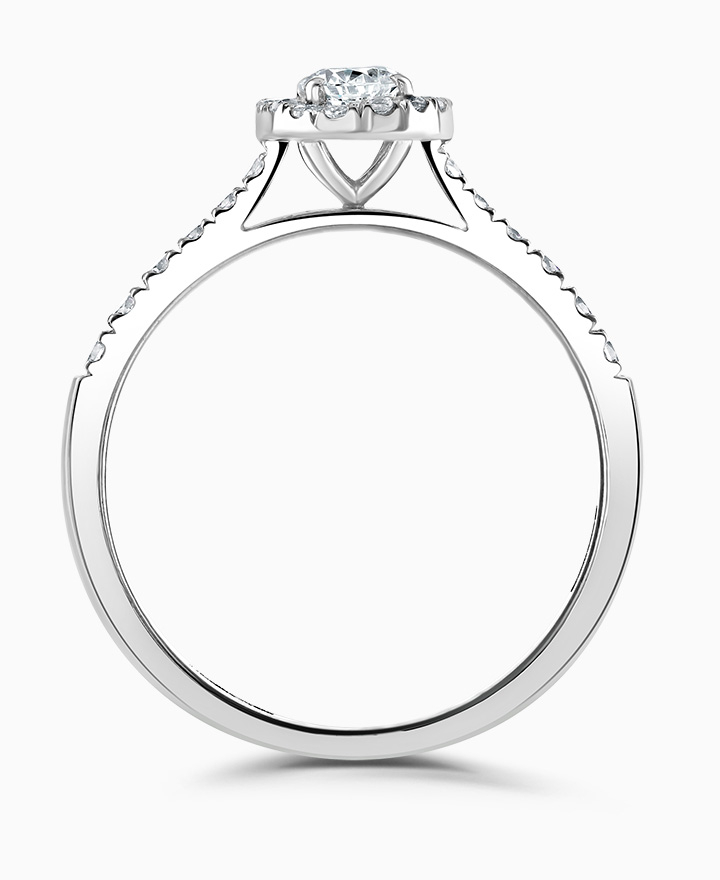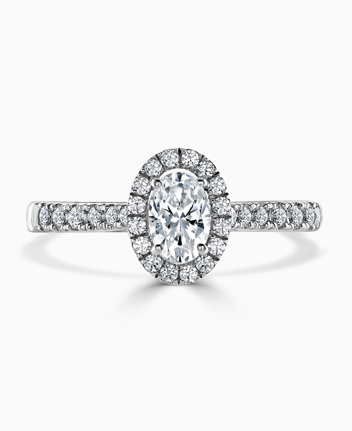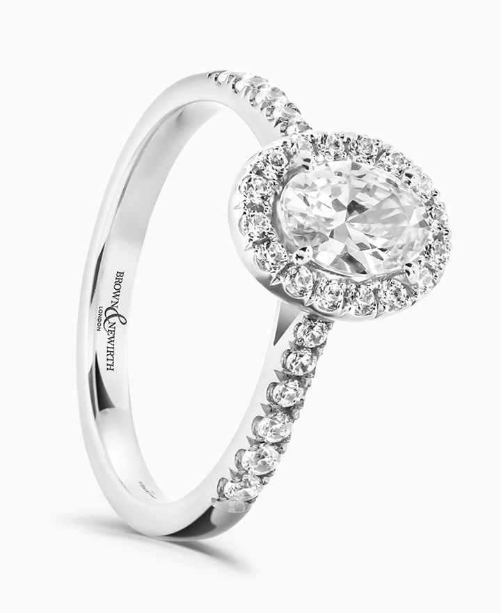 Handcrafted by Brown & Newirth; our signature 'bloom' floral detailing with diamond halo framing an oval cut G Vs diamond, presented here on a classic court band. Centre 0.50ct, total 0.80ct. Part of the Bloom Collection.