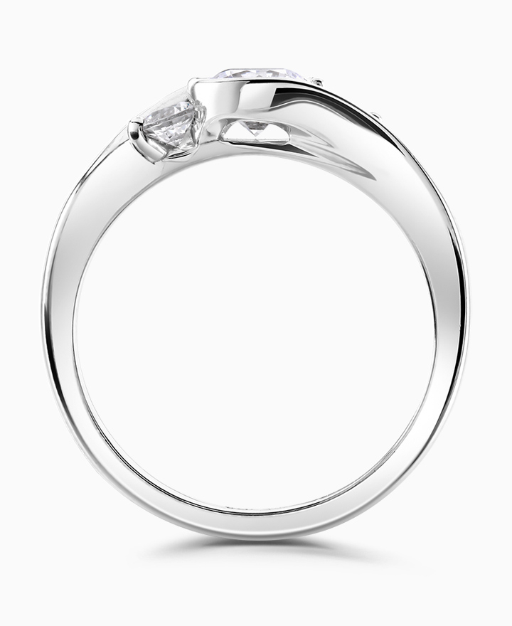 Handcrafted by Brown & Newirth; inspired by nature, organic lines twist up to embrace a trilogy of round brilliant cut diamonds, presented here on a classic court band. Centre 0.50ct, total 0.70ct. Part of the Entwined Collection.