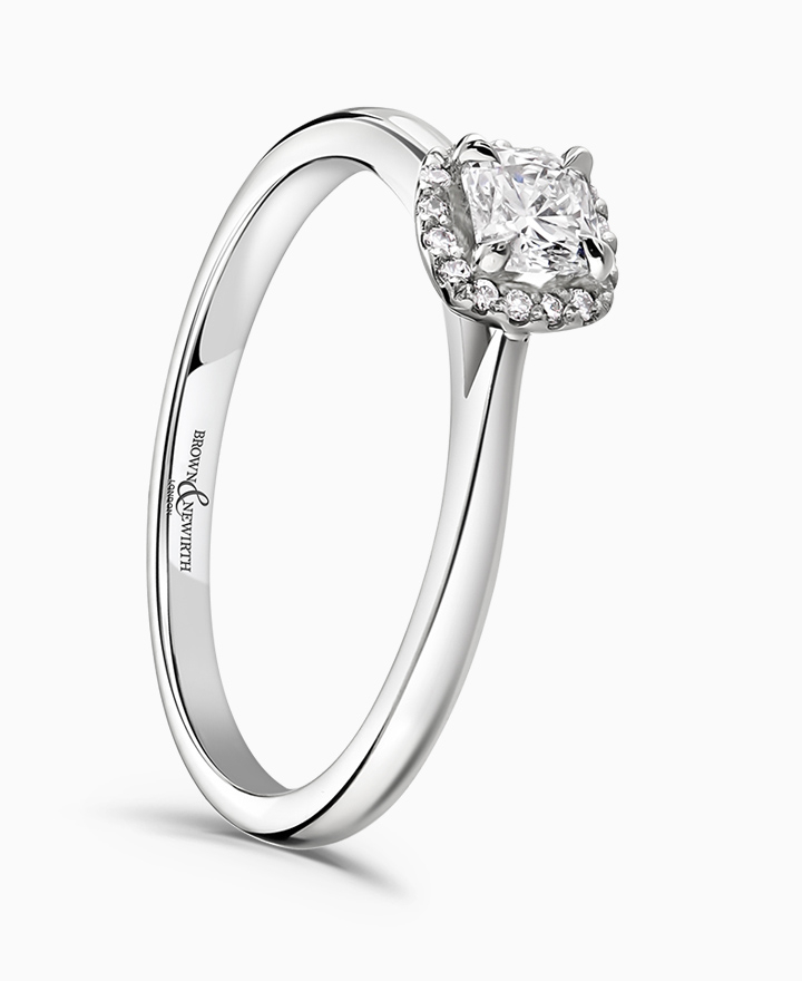 Handcrafted by Brown & Newirth; our signature 'bloom' floral detailing with diamond halo framing a cushion cut diamond, presented here on a classic court band. Centre 0.25ct, total 0.28ct. Part of the Bloom Collection.