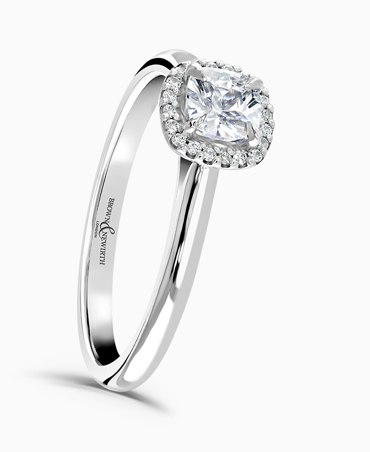 Handcrafted by Brown & Newirth; our signature 'bloom' floral detailing with diamond halo framing a cushion cut G Vs diamond, presented here on a classic court band. Centre 0.50ct, total 0.54ct. Part of the Bloom Collection.