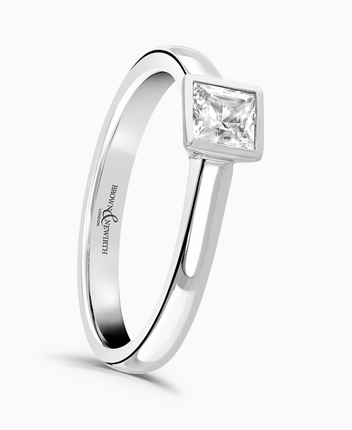 Handcrafted by Brown & Newirth; a bezel setting perfectly frames the square princess cut diamond, presented here on a straight edged band. 0.75ct