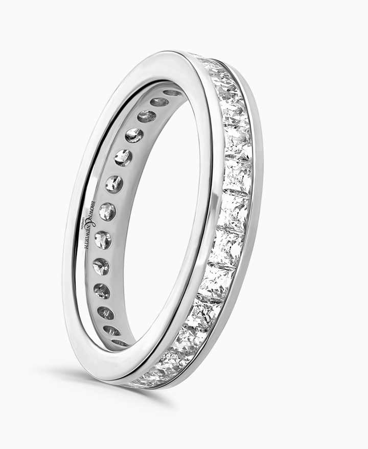 Handcrafted by Brown & Newirth; square princess cut diamonds sit edge to edge adorning the full hoop of this square edged band. Total carat weight 0.65ct