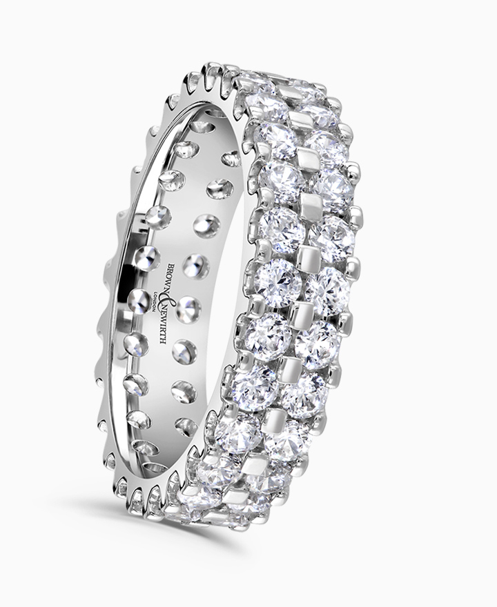 Handcrafted by Brown & Newirth; a double row of round brilliant cut diamonds adorn the full hoop of this square edged band. Total carat weight 2.00ct