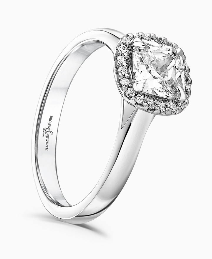 Handcrafted by Brown & Newirth; our signature 'bloom' floral detailing with diamond halo framing a cushion cut diamond, presented here on a classic court band. Centre 0.25ct, total 0.28ct. Part of the Bloom Collection.