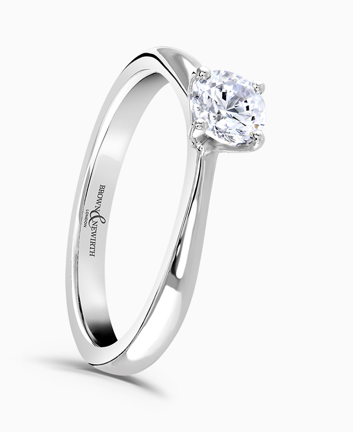 Handcrafted by Brown & Newirth; a minimal four claw setting hold the round brilliant cut diamond, presented here on a classic court band. 0.25ct
