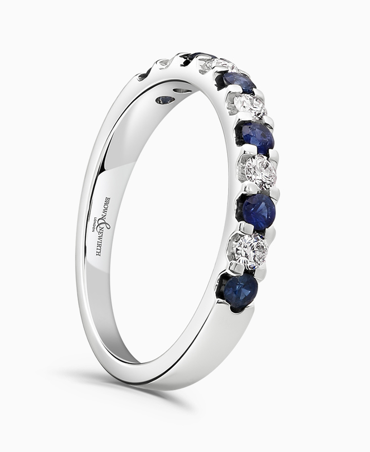 Handcrafted by Brown & Newirth; round brilliant cut diamonds and blue sapphires adorn 40% of this classic court band. Total carat weight 0.50ct