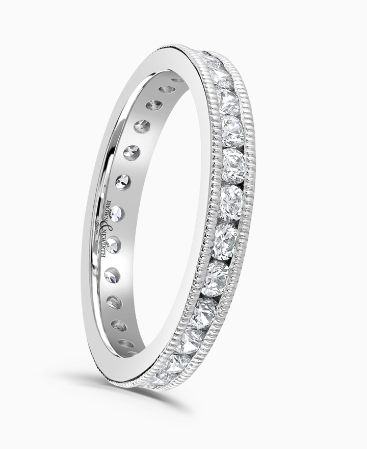 Handcrafted by Brown & Newirth; round brilliant cut diamonds adorn the full hoop of this square edged band finished with a mill grain edge. Total carat weight 0.50ct