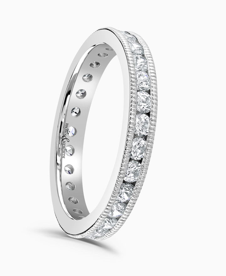 Handcrafted by Brown & Newirth; round brilliant cut diamonds adorn the full hoop of this square edged band finished with a mill grain edge. Total carat weight 0.75ct
