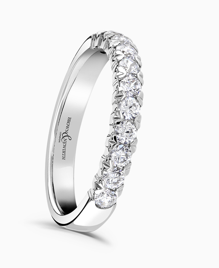 Handcrafted by Brown & Newirth; round brilliant cut diamonds adorn 50% of this classic court band. Total carat weight 0.75ct