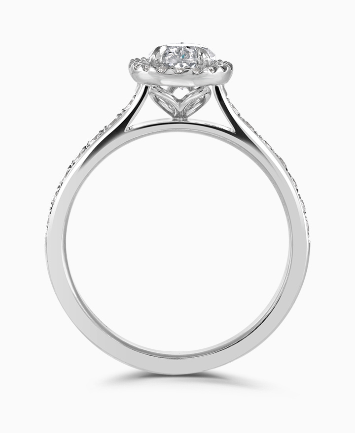 Handcrafted by Brown & Newirth; our signature 'bloom' floral detailing with diamond halo framing a pear cut diamond, presented here on a diamond set band. Centre 1.00ct, total 1.30ct. Part of the Bloom Collection.