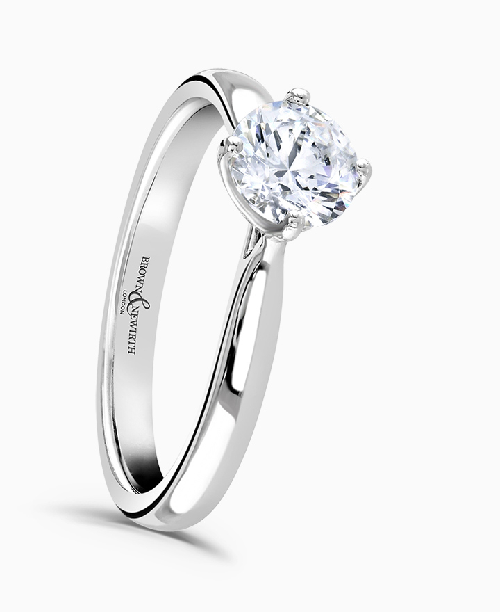 Handcrafted by Brown & Newirth; a symphony of striking lines criss-cross to hold the round brilliant cut diamond, presented here on a straight edged band. 0.25ct
