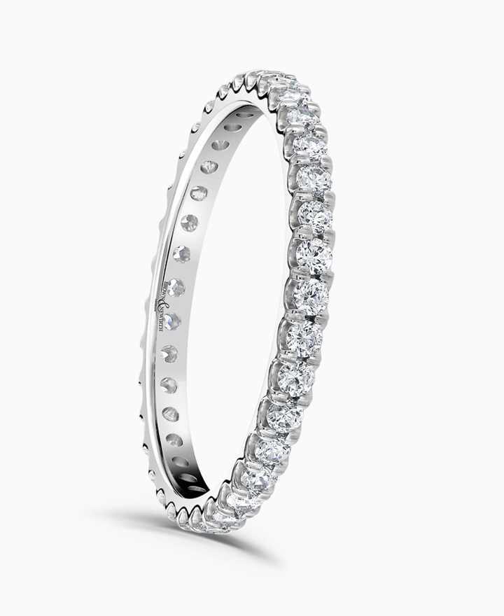 Handcrafted by Brown & Newirth; round brilliant cut diamonds adorn the full hoop of this straight edged band. Total carat weight 0.50ct