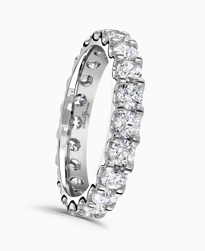 Handcrafted by Brown & Newirth; round brilliant cut diamonds adorn the full hoop of this straight edged band. Total carat weight 2.2ct