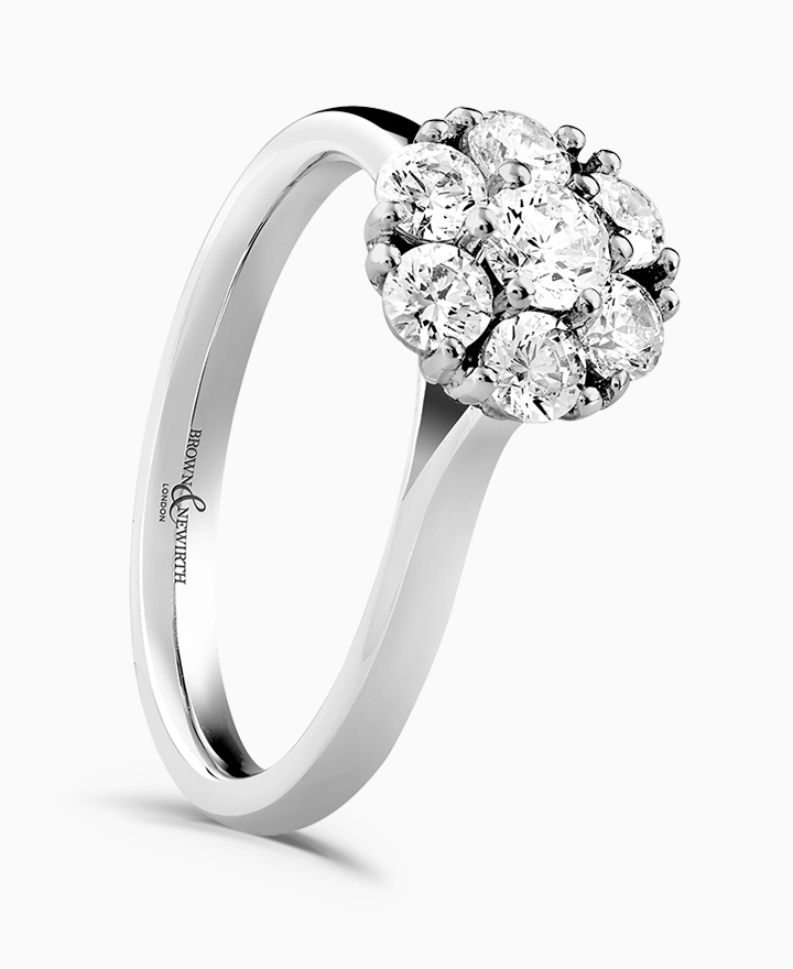 Handcrafted by Brown & Newirth; a delicate elevated cluster setting of round brilliant cut diamonds, presented here on a classic court band. 1.15ct