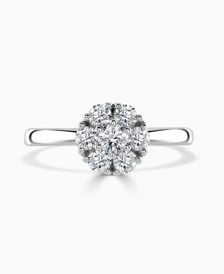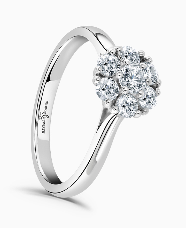 Handcrafted by Brown & Newirth; a delicate elevated cluster setting of round brilliant cut diamonds, presented here on a classic court band. 0.63ct