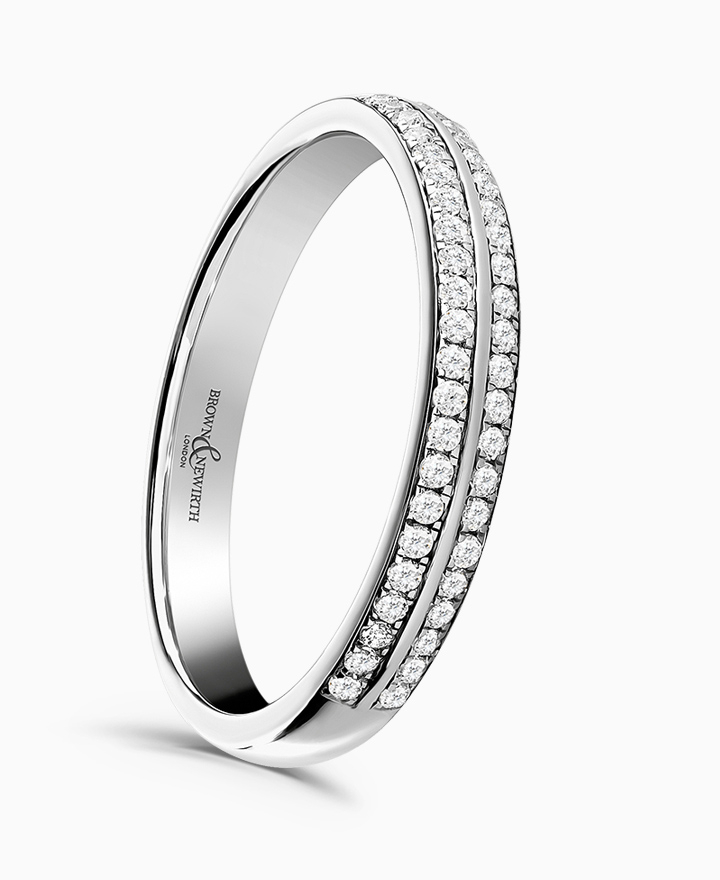 Handcrafted by Brown & Newirth; a double row of pave set round brilliant cut diamonds adorn 40% of this classic court band. Total carat weight 0.15ct