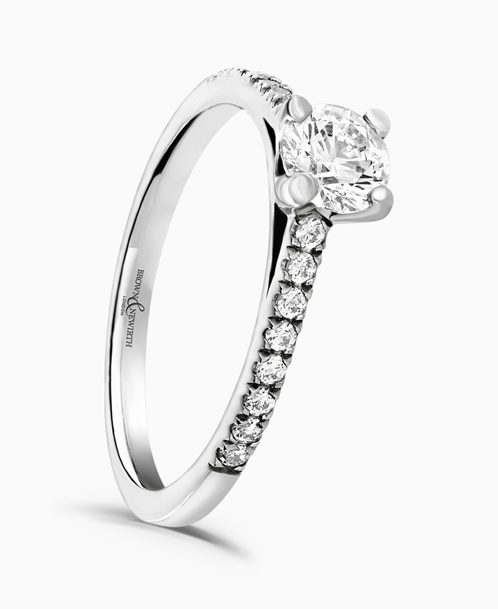 Handcrafted by Brown & Newirth; a delicate four claw setting perfectly elevates the round brilliant cut diamond, presented here with diamond set shoulders. Centre 0.30ct, total 0.41ct.