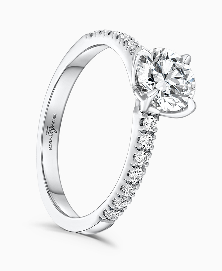 Handcrafted by Brown & Newirth; our signature 'bloom' floral detailing for a round brilliant cut F Si diamond, presented here with diamond set shoulders. Centre 0.50ct, total 0.70ct. Part of the Bloom Collection.