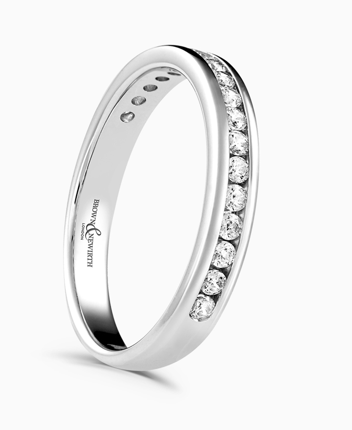 Handcrafted by Brown & Newirth; round brilliant cut diamonds adorn 50% of this straight edged band. Total carat weight 0.20ct. This is part of our in stock range, available in platinum & 18ct yellow gold. Order today for quick delivery.