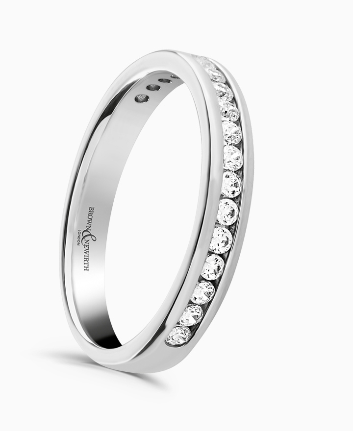 Handcrafted by Brown & Newirth; round brilliant cut diamonds adorn 50% of this straight edged band. Total carat weight 0.30ct. This is part of our in stock range, available in platinum & 18ct yellow gold. Order today for quick delivery.