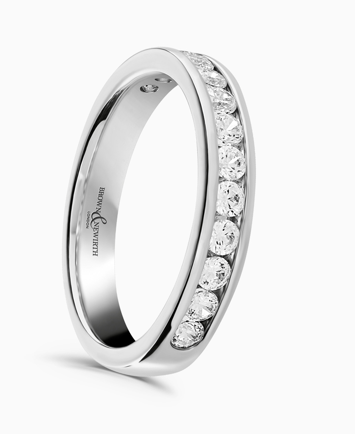 Handcrafted by Brown & Newirth; round brilliant cut diamonds adorn 50% of this straight edged band. Total carat weight 0.50ct. This is part of our in stock range, available in platinum & 18ct yellow gold. Order today for quick delivery.