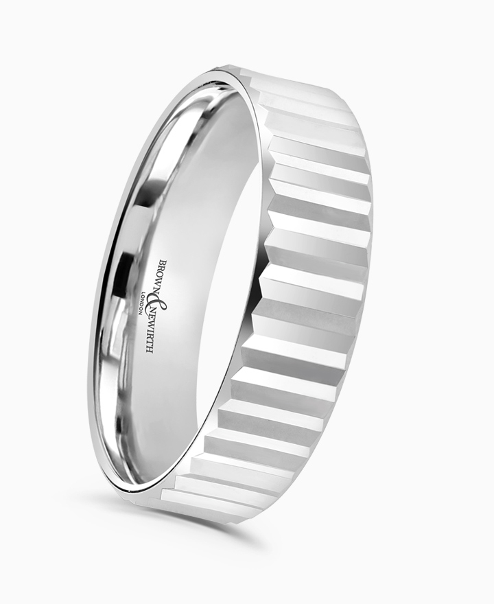 Handcrafted by Brown & Newirth; our flat top profile with v-groove patterning and bevelled edges, presented in a medium gauge. Part of the LOQD Collection